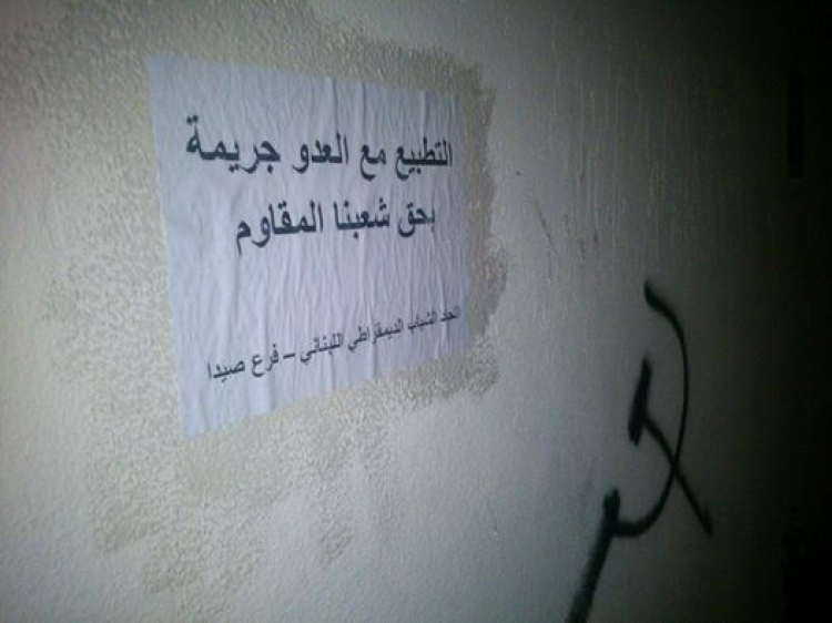 رفضا لكل اشكال التطبيع مع العدو الصهيوني، واستنكارا لزيارة البطرك الماروني الى فلسطين المحتلة، والخاضعه لسلطة الكيان المغتصب، استكمل اتحاد الشباب الديمقراطي اللبناني جهوده بتعليق الملصقات الرافضة للتطبيع والزيارة المشؤومة ولما كان الرفاق يقومون بتعليق تلك الملصقات في بوابة التحرير صيدا داهمتهم دورية من فرع المعلومات واوقفت احدى المجموعات العاملة على النشاط فاعتقل كل من الرفاق احمد عبدالله واشرف يزبك، وتحت حجج مختلفة لا تمت إلى القانون والمنطق بصلة جرى استبقاء الرفاق في المخفر ودون توجيه اي من الاتهامات لهم ولم يتم الإفراج عنهم إلى اليوم التالي. متى صارت مقاومة الاحتلال تهمة؟! متى صارت مقاطعة العدو انتهاكا!؟ متى اضحى التطبيع مشرعا!؟ متى صار النضال جريمة!؟والتعبير عن الراي مخالفة يحاسب عليها القانون!؟ في بلد ضاعت فيه المعايير يعتقل الرفاق لوطنيتهم. ولكننا في الاتحاد نؤكد بان هذا الدرب هو دربنا ولن نتراجع عن المشروع الذي به قدمنا النضالات والدماء ولن نتنازل للنظام الملتحف عباءة الدين وما تلك الاعتقالات الا محفزا على توسيع وانتشار الحملة الموكدة على رفض التطبيع والزيارة على كافة اراضي الوطن حيث ينتشر رفاقنا.