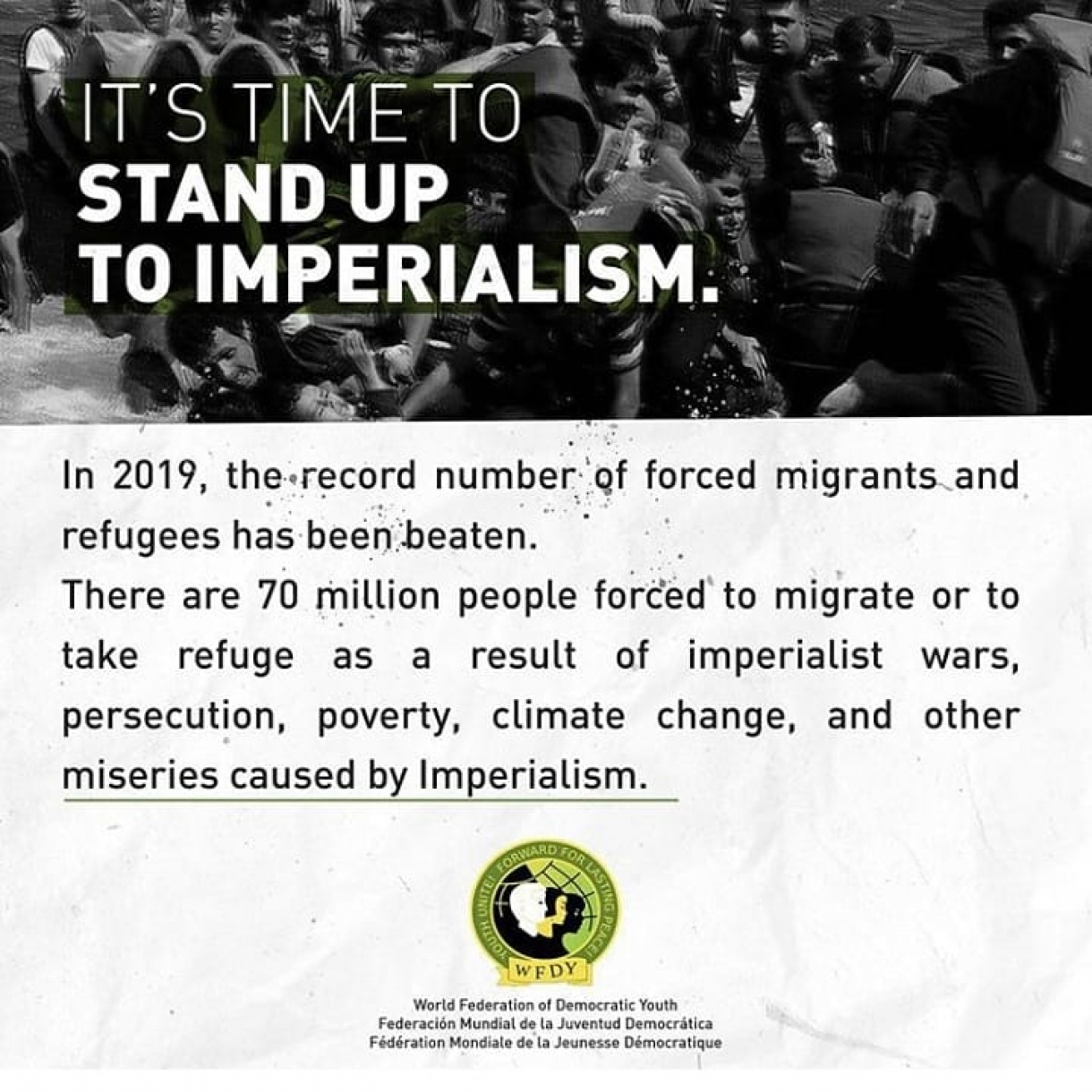 الامبريالية مسؤولة وبشكل اساسي عن الهجرة القسرية. هذا العام كان قياسيا في ارتفاع معدلات الهجرة القسرية والتي تعد الامبريالية بحروبها وسياساتها مسؤولة عنها.اكثر من سبعين مليون انسان هاجروا قسريا نتيجة الحروب الامبريالية والتغيير المناخي والفقر وغيرها من المشاكل التي تسببت بها الامبريالية.